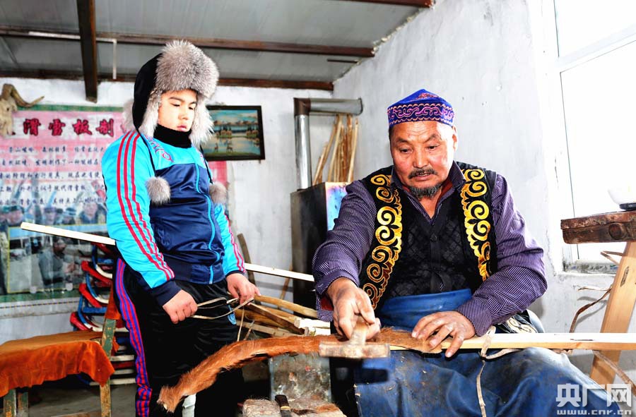 斯蘭別克在制作馬皮滑雪板(黃光輝攝) 記者在阿勒泰市拉斯特鄉(xiāng)走訪了哈薩克族牧民斯蘭別克。斯蘭別克是新疆維吾爾自治區(qū)非物質(zhì)文化遺產(chǎn)哈薩克族馬皮滑雪板制作傳承人。他給到訪的記者演示了阿勒泰地區(qū)古老毛皮滑雪板制作工藝。至今,在阿爾泰山區(qū)大雪封山的冬季,這種古老毛 皮滑雪板仍是農(nóng)牧民的重要交通工具。 -