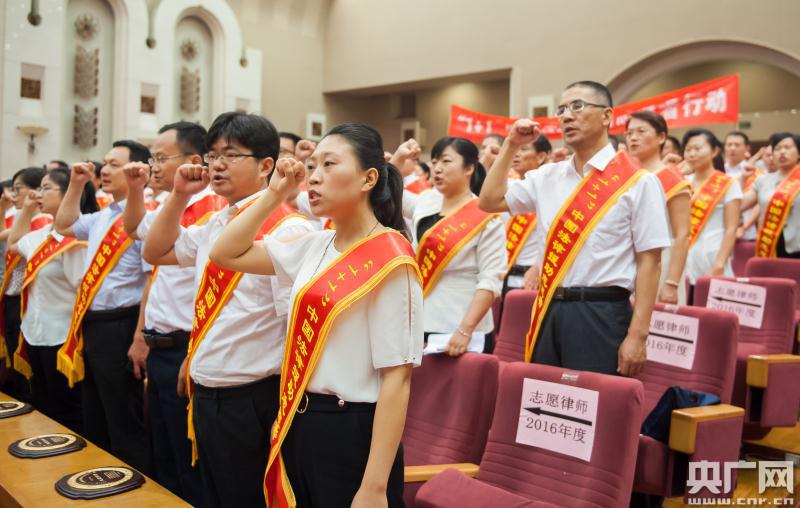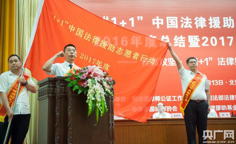 央廣網(wǎng)北京7月13日消息(記者孫瑩)據(jù)中國之聲《央廣新聞》報(bào)道,2017年度“1+1”中國法律援助志愿者行動啟動儀式在北京人民大會堂舉行,242名律師和大學(xué)生志愿者從司法部部長、黨組書記張軍手中接過了“1+1”中國法律援助志愿者行動旗幟,并莊嚴(yán)宣誓,他們將奔赴青海、西藏、新疆、貴州等14個(gè)。▍^(qū)、市)和新疆生產(chǎn)建設(shè)兵團(tuán)的170多個(gè)縣(區(qū)),開展為期一年的法律援助志愿服務(wù),扶貧攻堅(jiān)。