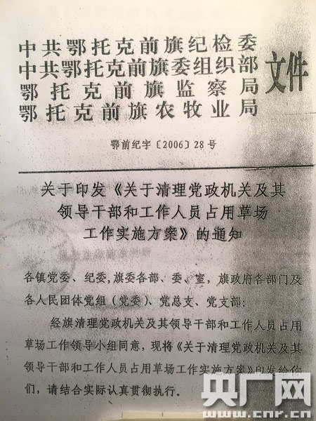 央廣網(wǎng)鄂爾多斯4月20日消息(記者白宇 管昕)據(jù)中國之聲《新聞縱橫》報(bào)道,近日,有內(nèi)蒙古自治區(qū)鄂托克前旗牧民向中國之聲反映說,第二輪土地承包開始之后,當(dāng)?shù)攸h政機(jī)關(guān)、企事業(yè)單位、領(lǐng)導(dǎo)干部以及公職人員大面積承包、轉(zhuǎn)包農(nóng)牧民草場牟取利益。2006年至今的10年間,自治區(qū)曾多次發(fā)文要求限期清理,但現(xiàn)在仍有部分牧民難以收回原本就屬于自己的30年草原承包經(jīng)營權(quán)。