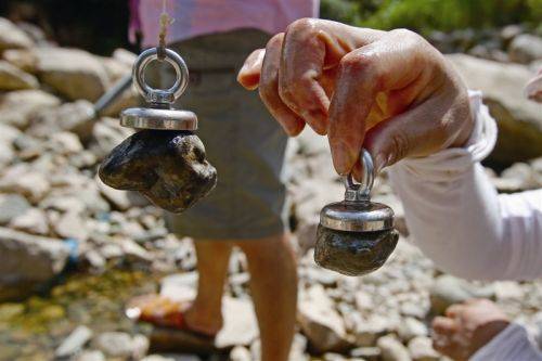 傳說中出產(chǎn)“黑金石”的溪灘位于浙江溫州樂清市芙蓉鎮(zhèn)的黃岙坑。溪灘的水不多,老百姓集中挖石頭的地方,長度不到200米。經(jīng)過1個多月的“挖寶”,溪灘上很多石頭都被翻了個身,特別是一些約上百斤重的大石頭下面,被挖出大大小小的坑。芙蓉鎮(zhèn)后垟村黨支部書記林景智介紹,最早發(fā)現(xiàn)石頭特別的是外地人。3年前,有村里人將石頭賣到臺州。一買家發(fā)現(xiàn)這個石頭有點特別——可以用磁鐵吸住。隨后,臺州那邊有不少人來挖石頭。這個現(xiàn)象被一名后垟村村民發(fā)現(xiàn),于是也跟著挖石頭,并賣給臺州的買家。今年2、3月份,溪灘上的石頭能賣錢的消息在微信朋友圈里傳開,來挖的人更多了,8月份的時候有上百人同時在挖,路上都停滿了車子。