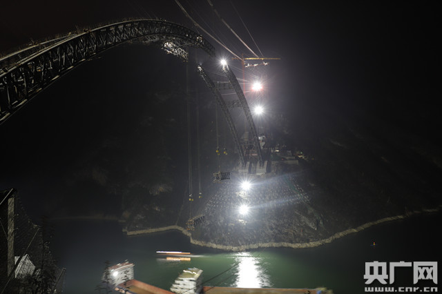 巫山縣位于重慶市東部,地處三峽庫區(qū)腹心,素有“渝東北門戶”之稱。巫山大寧河雙線大橋位于重慶市巫山縣桂花村,全長372米,主橋設計為282米中承式鋼管混凝土平行拱橋,設計時速350km/h,是全國首座大跨度高速鐵路中承式鋼管拱外包混凝土平行拱橋。此次合龍的巫山大寧河雙線大橋,其39個總重約2200噸的拱肋吊裝節(jié)段均通過夜間高空吊裝完成。