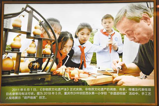 一位頭發(fā)花白的長者低著頭創(chuàng)作“葫蘆烙畫”,吸引了多名學(xué)生圍觀……在國家博物館“偉大的變革——慶祝改革開放40周年大型展覽”第四展區(qū)第三單元,一張“非遺進校園”的照片引人注目。據(jù)了解,圖中的長者正是重慶市級非遺項目“葫蘆烙畫”的代表性傳承人張居常。