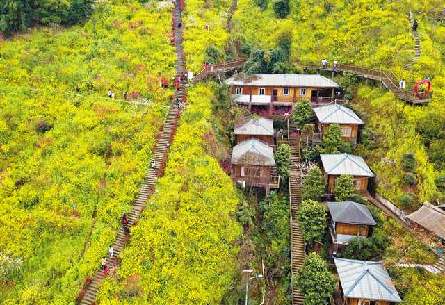 這條步道2017年建成投用,全長(zhǎng)約8公里,連接了黑山谷1098假日酒店、黑山谷國(guó)際運(yùn)動(dòng)醫(yī)院、百花谷旅游度假區(qū)、黑山露營(yíng)基地等,集旅游觀光、餐飲住宿、休閑娛樂(lè)、健康養(yǎng)生等諸要素為一體,年接待游客上千萬(wàn)人次。尤其在夏季避暑時(shí)節(jié),市民、游客蜂擁而至,整條步道“比解放碑還熱鬧”。