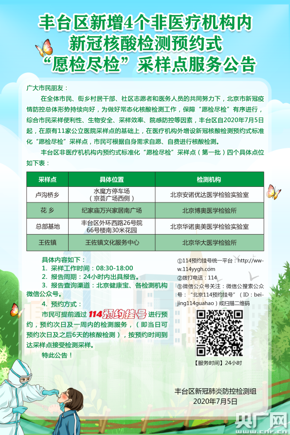 (豐臺區(qū)核酸檢測預約式“愿檢盡檢”服務公告。)
