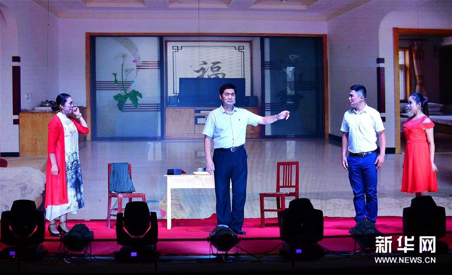 9月7日晚,河南濮陽(yáng)精準(zhǔn)扶貧文藝巡演活動(dòng)走進(jìn)清豐縣馬村鄉(xiāng)白馬楊村,演員在表演四平調(diào)《不講排場(chǎng)又如何》。為充分發(fā)揮文藝作品在扶貧攻堅(jiān)工作中的“扶志”和“扶智”作用,河南濮陽(yáng)圍繞扶貧攻堅(jiān)主題積極組織文藝創(chuàng)作,廣泛開(kāi)展文藝宣傳活動(dòng)。8月中旬至10月中旬,濮陽(yáng)將在全市五縣一區(qū)開(kāi)展文藝巡演活動(dòng)100場(chǎng)次。新華社記者馮大鵬攝