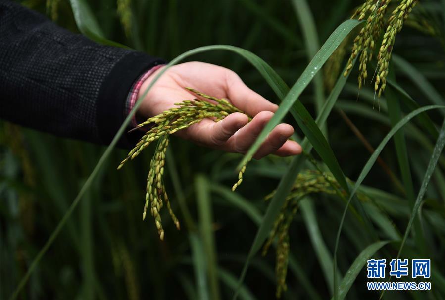 10月16日,在位于湖南長沙縣金井鎮(zhèn)的“巨型稻”試驗田,工作人員查看“巨型稻”的稻穗。水稻長得比人高、畝產可達800千克以上--中國科學院亞熱帶農業(yè)生態(tài)研究所10月16日正式發(fā)布一種水稻新種質,株高可達2.2米,具有高產、抗倒伏、抗病蟲害、耐淹澇等特點,被認為開啟了水稻研制的一扇新門。新華社記者李尕攝 -
