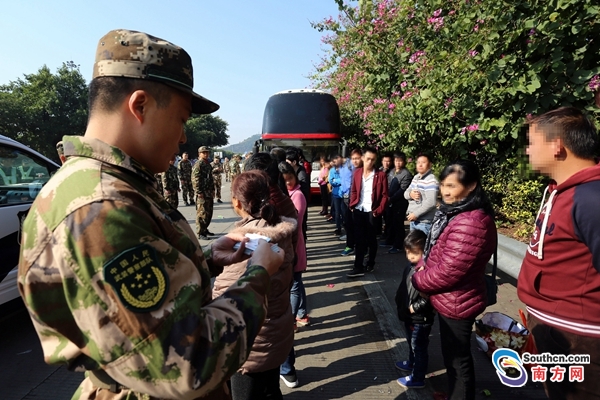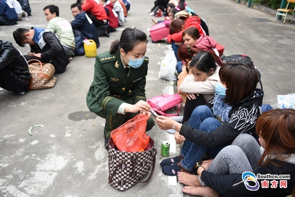 2月13日,惠州市公安邊防支隊(duì)官兵逐一核對(duì)大巴車上的人員信息。顧俊鋒 攝