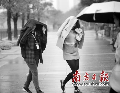 6日的廣州陰雨綿綿,花城廣場(chǎng),用衣服遮頭的兩名女子在雨中前行。記者肖雄攝