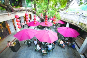食客愛在泮溪酒家天井的大樹下,撐幾把大大的遮陽傘,在傘下嘆早茶。