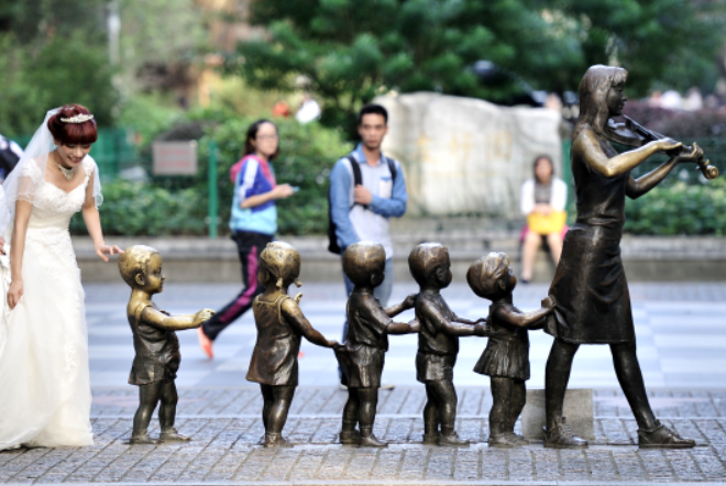 雕塑是關(guān)于一座城市的記憶。當(dāng)你信步徜徉在廣州CBD的高樓大廈間,隨時(shí)可能與一尊尊大師作品不期而遇。這些生動(dòng)形象的雕塑讓人一下子記住廣州,愛上廣州。圖為夏日的沙面,一對(duì)新婚夫婦跟在一群雕塑娃娃后頭,聆聽幸福的音符。(廣報(bào)全媒體記者 邵權(quán)達(dá) 攝影報(bào)道)
