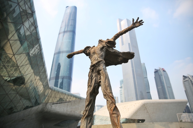 廣州大劇院一尊主題為《狂歌》的人物雕塑張開雙臂擁抱現(xiàn)代化的廣州城。