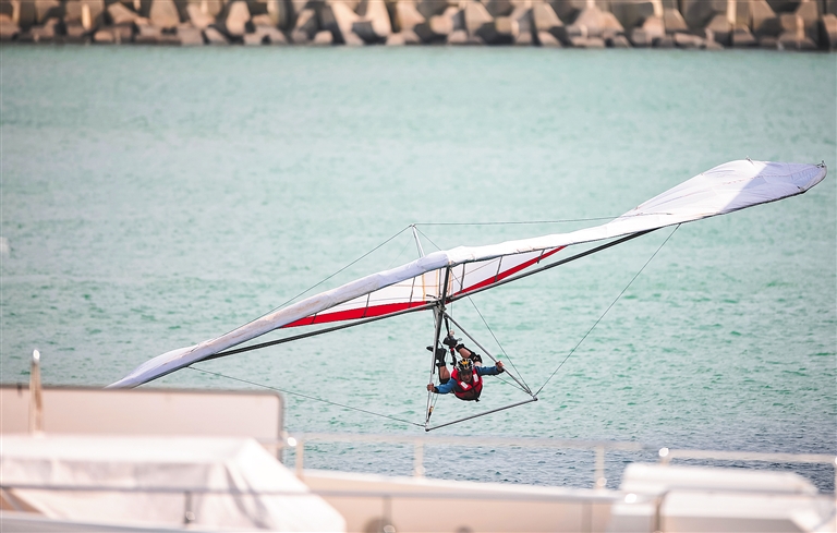 1月1日,萬寧石梅灣,航空愛好者正在參加第八屆中國鳥飛人大賽競技,用獨(dú)特的飛行方式迎接新年的到來。海南日?qǐng)?bào)記者 袁琛 攝
