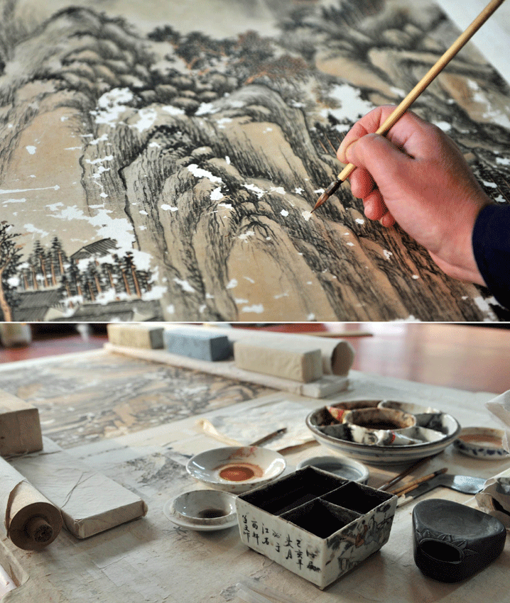 博物院的文物保護(hù)技術(shù)人員在進(jìn)行全色。全色是古書畫修復(fù)的一道工序,對(duì)缺失部分進(jìn)行補(bǔ)色。這個(gè)程序?qū)饩要求很高,幾乎都是在自然光下進(jìn)行。