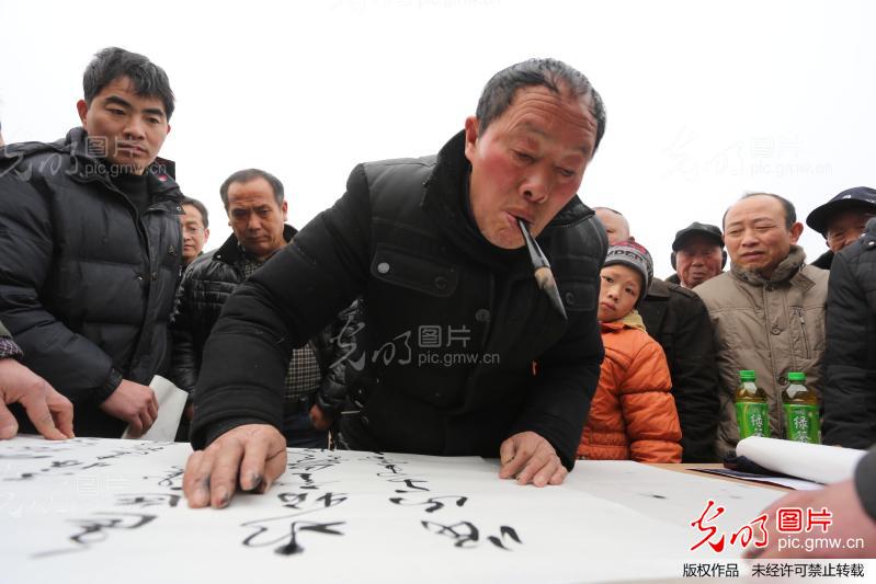央廣網(wǎng)河南分網(wǎng)消息 據(jù)光明網(wǎng)報道:2014年2月15日,農(nóng)民書畫家黃東升正在現(xiàn)場揮毫潑墨為市民游客義寫“口筆”書法作品。