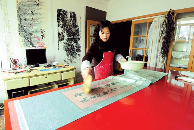 “宣紙和漿糊的質(zhì)量好,可延長書畫的保存期!绷焊F秸f,她裝裱用的漿糊都是自己特制的,宣紙也是自己到宣紙生產(chǎn)廠家定制的。刷漿糊時,要先用手試其厚薄,漿糊用得多,裱好的書畫容易發(fā)硬、出現(xiàn)瓦卷;漿糊用得少,則容易脫層。