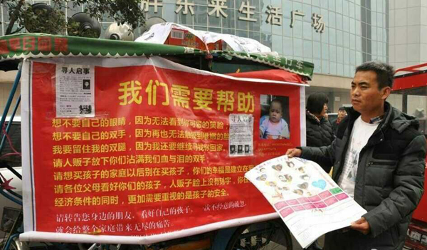 如今,他一邊尋找孩子一邊走街串巷向人們宣傳防拐孩子知識(shí)。1月28日,記者致電伍興虎。他說:在許昌感謝眾多好心人的幫助,已經(jīng)從許昌走到新鄭了。昨晚,他在網(wǎng)友——“禹州風(fēng)”的幫助下住在新鄭某旅館,今天還要啟程冒雪踏上尋子路,目前,伍興虎有一個(gè)4歲的兒子和2歲的女兒,在老家由媳婦和母親一起照看。而自己是獨(dú)自騎車走遍全國(guó)各個(gè)地市踏上尋子之路。孩子丟失時(shí),只有13個(gè)月大。在2008年12月10日凌晨2點(diǎn)多。一家人在睡夢(mèng)中醒來發(fā)現(xiàn)孩子不見了,而自己家的大門敞開著。他說自己家是農(nóng)村的,離公路約兩里路。偷走自己兒子的罪犯一定是有預(yù)謀,開車偷走的。當(dāng)時(shí),睡夢(mèng)中的一家人醒來著急痛哭報(bào)案尋找,可至今無果。于是,自己下決心走上尋子路。他每到一處,給大家發(fā)放宣傳單和伍嘉誠(chéng)一歲時(shí)的照片和身份信息。傳單上還印著別的地方丟失孩子的信息。