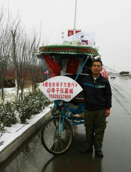 伍興虎跑遍中國(guó)的交通工具是一輛人力三輪車,車身上寫著“尋人啟事”、“黃包車萬里尋子”等字樣。車上還放著《寶貝回家》的歌曲。他將印有防拐知識(shí)的尋子傳單發(fā)給圍觀群眾。