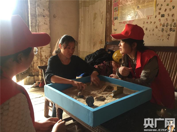 心理輔導(dǎo)老師孔慧先讓薛秋風(fēng)雙手放進(jìn)沙盤(pán),然后和薛秋風(fēng)進(jìn)行溝通交流,讓薛秋風(fēng)根據(jù)自己所思所想,隨機(jī)挑選了幾樣沙具,薛秋風(fēng)挑選了帽子,橋,房子等5樣沙具。孔慧和薛秋風(fēng)溝進(jìn)行了溝通:“挑選帽子是因?yàn)槟锛易≡谘睾,夏天常在沙灘上玩耍,太?yáng)太熱,挑選帽子沙具為了遮陽(yáng),那時(shí)候經(jīng)常想過(guò)河,可是沒(méi)有橋,就挑選了一個(gè)橋的沙具,至于房子沙具,” 薛秋風(fēng)說(shuō):“現(xiàn)在全家五間屋架房,一家六口人住,我太想要一座大房子了!