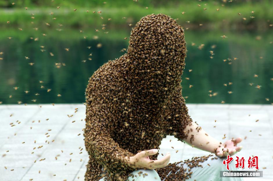 央廣網(wǎng)河南分網(wǎng)消息 據(jù)中新網(wǎng)報(bào)道:5月13日,“吉尼斯中國(guó)之夜”在江西宜春明月山明月廣場(chǎng)舉行。江西“第一蜂人”、宜春市奉新縣養(yǎng)蜂人阮良明挑戰(zhàn)“人體肩部以上布滿(mǎn)蜜蜂堅(jiān)持時(shí)間最長(zhǎng)”吉尼斯世界紀(jì)錄。最終,吉尼斯認(rèn)證官宣布,阮良明的人體肩部以上布滿(mǎn)蜜蜂堅(jiān)持時(shí)間為53分34秒,成功創(chuàng)造了吉尼斯世界紀(jì)錄。(鄒海斌 攝)