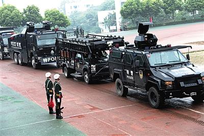 2014年5月14日,四川廣安市開展反恐防暴暨應(yīng)急處突綜合實戰(zhàn)演練,來自公安戰(zhàn)線的特警在進行特種車輛展示。