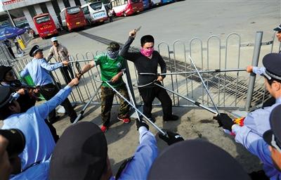 央廣網(wǎng)河南分網(wǎng)消息 據(jù)新華網(wǎng)報道:2014年5月9日,濟南長途汽車總站舉行反恐演練,兩名蒙面“歹徒”持刀傷人,車站啟動“防暴反恐報警系統(tǒng)”,1分鐘內(nèi)趕到3批反恐力量將“歹徒”制服。