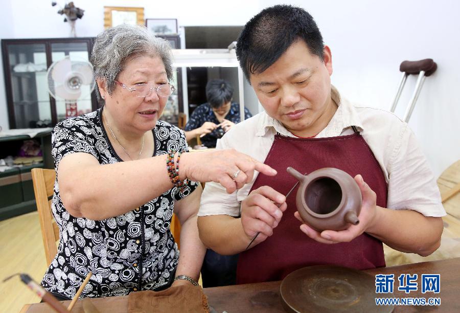 6月23日,在江蘇宜興紫砂陶藝名家曹婉芬的工作室,曹婉芬(左)在指導(dǎo)身有殘疾的“徒弟”唐國忠制作紫砂壺。