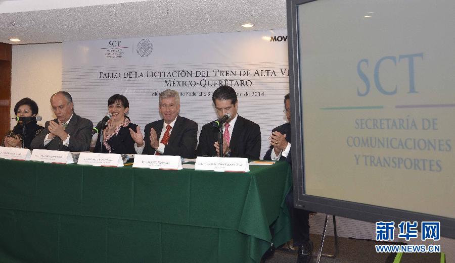 央廣網(wǎng)河南分網(wǎng)消息 據(jù)新華網(wǎng)報道:11月3日,墨西哥通信和交通部長魯伊斯·埃斯帕薩(左四)等人在首都墨西哥城出席新聞發(fā)布會。北京時間11月4日凌晨,墨西哥通信和交通部宣布,由中國鐵建牽頭的國際聯(lián)合體中標墨西哥國內(nèi)首條高鐵——墨西哥城至克雷塔羅高速鐵路項目。這是中國在海外設(shè)計、承建并完全采用中國標準和裝備的首條時速300公里高鐵,是中國高鐵“走出去”真正意義上的“第一單”。新華社發(fā)(墨西哥通信和交通部提供)