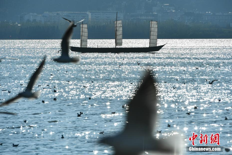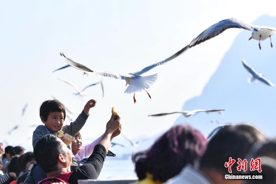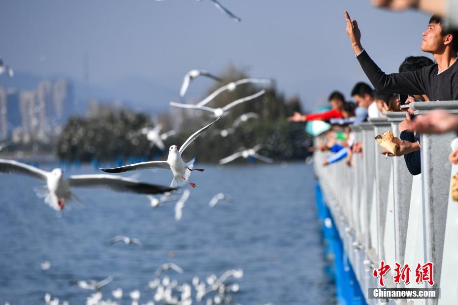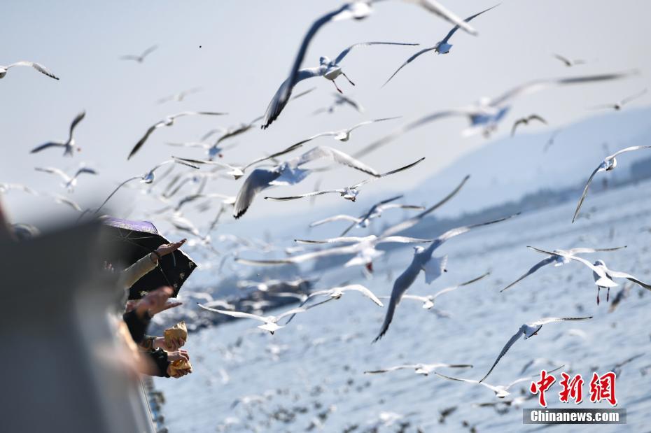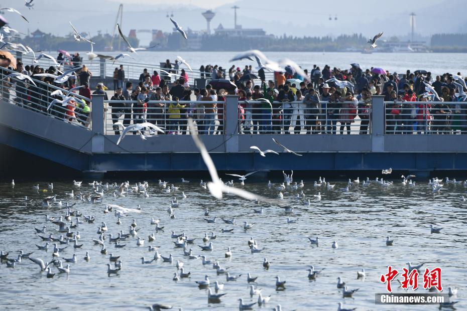 11月5日,近萬只紅嘴鷗抵達(dá)昆明滇池,吸引游客觀賞喂食。隨著冬天的臨近,越來越多的紅嘴鷗將來到昆明,據(jù)了解,每年冬季約有4萬只紅嘴鷗從西伯利亞來昆明滇池流域越冬。 中新社記者 任東 攝 -