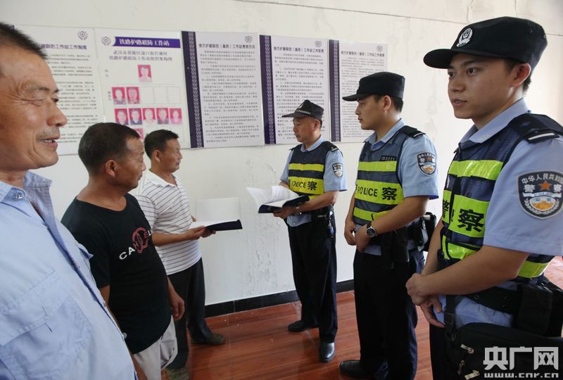行駛在蜿蜒曲折的鄉(xiāng)村小路上,說實話,每一處的十字路口和丁字便道,對于我們來說還真有些蒙圈。“這是東升村,下轄易家上灣、易家下灣、張家灣等9個村灣,常住人口1400余人……”黃所長駕輕就熟的介紹著。大約20分鐘,我們來到了東升村村委會,這里也是東升村護路聯(lián)防工作站。村委會主任嚴建喜向我們介紹:“高鐵是我們國家的一張名片,為保障廣大群眾的生命財產(chǎn)和鐵路運輸安全,2016年7月份以來,黃陂區(qū)護路辦聯(lián)合轄內(nèi)鐵路派出所開展護路聯(lián)防工作站建設(shè)!彪S嚴主任步入室內(nèi),早已在此等候的民警劉偉迎了過來,他是橫店東警務(wù)區(qū)民警,該警務(wù)區(qū)是橫店東所四個警務(wù)區(qū)之一!澳銈兛,我還是護路聯(lián)防工作站副站長”,順著劉偉手指的方向,整潔的墻面上,依次懸掛著護路工作站工作制度、職責(zé)牌和組織架構(gòu)圖。護路聯(lián)防工作站,這樣一個組織,將高鐵沿線治安管理工作,更為透徹的融入到地方綜治體系,整合路地多方力量聯(lián)合護路,有效提升了高鐵安防效能。橫店東所4個警務(wù)區(qū)的駐站民警,都是各自轄區(qū)護路工作站的副站長。目前“高鐵安全、路地共建”的協(xié)作理念,已在橫店東所管轄的88公里高鐵沿線全面落地生根。
