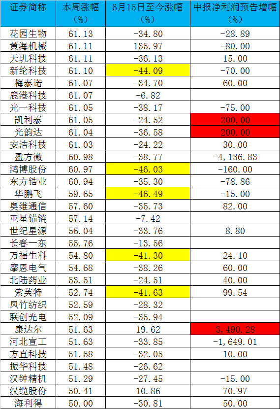 統(tǒng)計(jì)數(shù)據(jù)顯示,本周A股共2058只個(gè)股上漲,169只個(gè)股超過30%,漲幅超過20%的個(gè)股也有400只。剔除年內(nèi)上市的公司,部分本周漲幅靠前個(gè)股跌幅仍較大,后市值得重點(diǎn)關(guān)注。