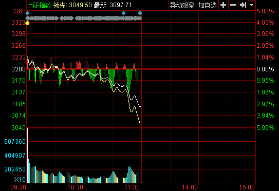 截止午盤,滬指報3097.71點,跌102.52點,跌幅3.20%;深成指報9994.34點,下跌469.35點,跌幅4.49%;創(chuàng)業(yè)板報1937.28點,下跌123.22點,跌幅5.98%。