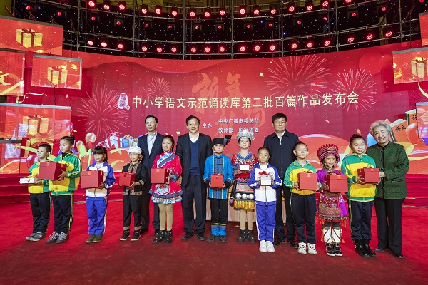 2018年12月23日下午,中央廣播電視總臺、教育部、國家語委聯(lián)合舉辦“中小學語文示范誦讀庫”第二季作品發(fā)布會。中宣部副部長、中央廣播電視總臺臺長慎海雄,教育部副部長、國家語委主任杜占元,中央廣播電視總臺副臺長閻曉明出席發(fā)布會,并共同見證第二批100篇音頻教材正式上線發(fā)布。 新華社記者沈伯韓 攝
