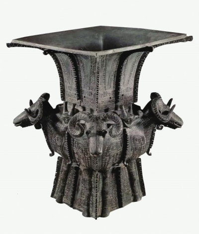 “羊作”中最有名氣的無疑是現(xiàn)藏于國家博物館的四羊方尊,這件重達34.5公斤的禮器是傳世商代青銅器作品中保存最為完好且體量最大的一個。藝術(shù)史研究者楊衛(wèi)稱,“古語說羊大為美,在人類社會早期,以牛羊為祭品的情況非常普遍,而在祭祀的禮器中取羊的造型也是自然而然的事情”。