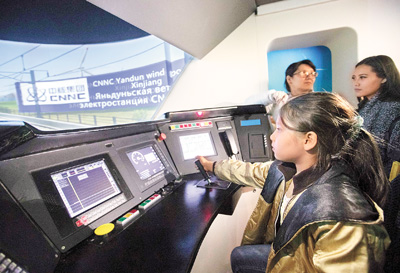 6月10日,阿斯塔納專項世博會中國館在哈薩克斯坦首都阿斯塔納正式開館,中國高鐵作為館內(nèi)最具代表性的成果之一,引來一批批參觀者駐足參觀。圖為一名參觀者在高鐵操作臺體驗?zāi)M駕駛。