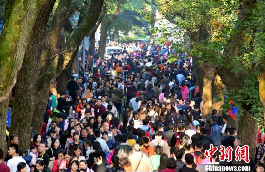 長沙岳麓山楓葉迎觀賞期 游客扎堆,長沙岳麓山楓葉進入最佳觀賞期。盧文偉 攝 楓樹林下聚集大批游客拍照留念。盧文偉 攝 11月26日,長沙岳麓山上迎來眾多游客扎堆賞楓。
