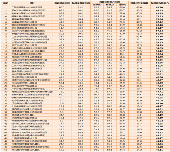 為全面評估國家生態(tài)旅游示范區(qū)品牌影響力,人民網(wǎng)輿情監(jiān)測室旅游大數(shù)據(jù)中心發(fā)布2017年度中國生態(tài)旅游示范區(qū)排行榜(Top50)。榜單以國家生態(tài)旅游示范區(qū)游客期待程度、旅游目的地好評度、媒體報(bào)道影響以及官方認(rèn)證微博、微信為評價(jià)對象,綜合考察游客期待指數(shù)、品牌美譽(yù)度指數(shù)、媒體引導(dǎo)力以及自媒體影響力(活躍度、傳播力和互動(dòng)力)四個(gè)維度。通過海量數(shù)據(jù)分析和數(shù)理模型計(jì)算,全面呈現(xiàn)國家生態(tài)旅游示范區(qū)品牌綜合影響力的發(fā)展現(xiàn)狀。
