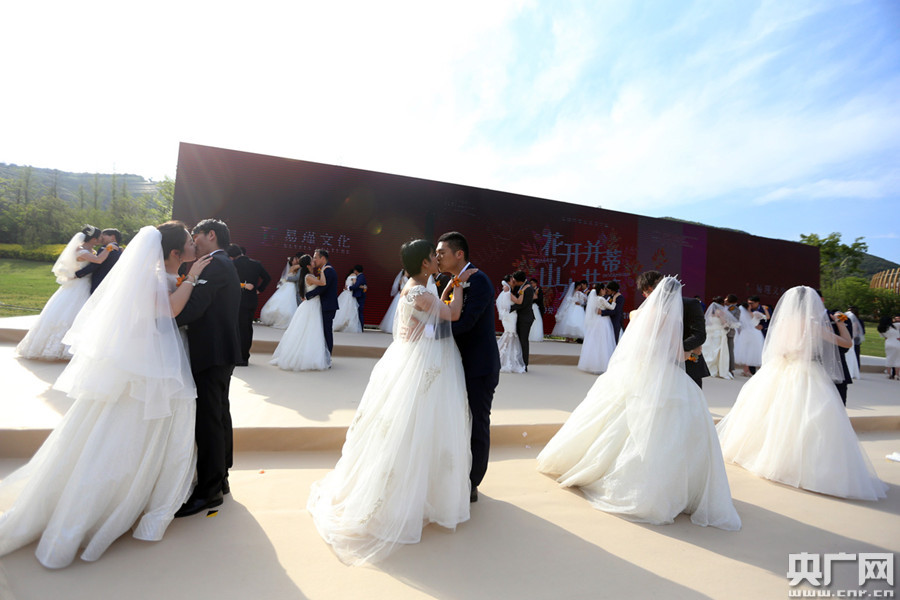 新人們?cè)诩w婚禮現(xiàn)場(chǎng)相擁親吻(央廣網(wǎng)記者 魏煒 攝)