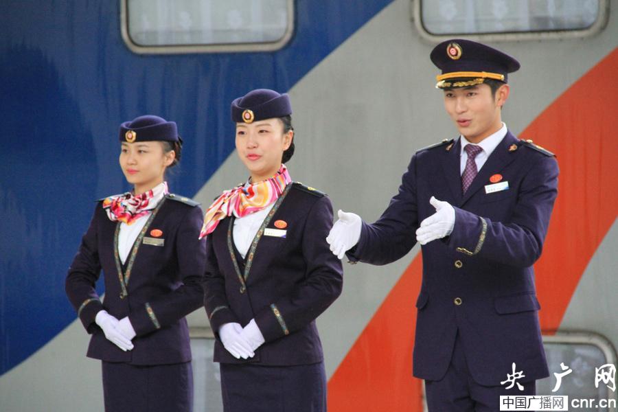 列車員展示文明服務(wù)(央廣網(wǎng)記者 李健飛 攝)