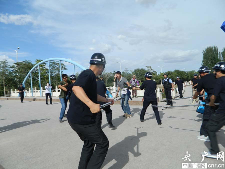 反恐演練的內容是:兩名“暴恐分子”手持管制刀具強行闖入校園,門衛(wèi)阻攔無果,報警組迅速觸發(fā)校園一鍵式報警器,同時通知學校指揮組,迅速向 110報警。