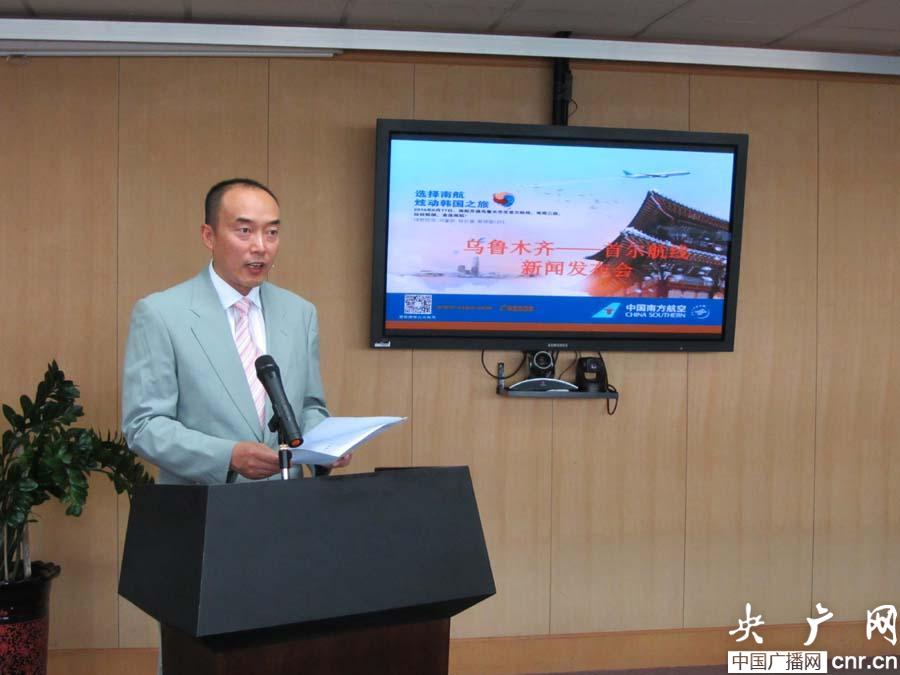 南航新疆分公司副總經(jīng)理張勝介紹新航線(央廣網(wǎng)記者 吳卓勝 攝)