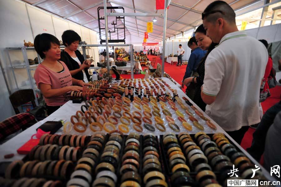 克拉瑪依玉石展,顧客在選購金絲玉首飾(央廣網(wǎng)記者 張雷 攝)
