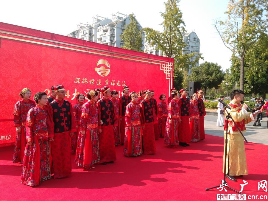 央廣網(wǎng)杭州10月25日消息(記者張國(guó)亮)今天下午,10對(duì)新人在杭州拱墅區(qū)在大運(yùn)河旁邊的信義坊廣場(chǎng)和富義倉(cāng)等遺址點(diǎn)舉行了“湖墅婚典”傳統(tǒng)式集體婚禮,以此來(lái)慶祝大運(yùn)河今年申遺成功。大運(yùn)河湖墅婚典承載著復(fù)活運(yùn)河婚俗文化、促進(jìn)產(chǎn)業(yè)發(fā)展,帶動(dòng)旅游觀光業(yè)發(fā)展的重任。此次婚典采用中式婚禮,整個(gè)流程包括橋西待嫁、漕坊接親、信義盟誓、富義娶親、運(yùn)河走運(yùn)、香積祈禱、大兜喜宴等,每個(gè)流程都融入了大運(yùn)河的元素。