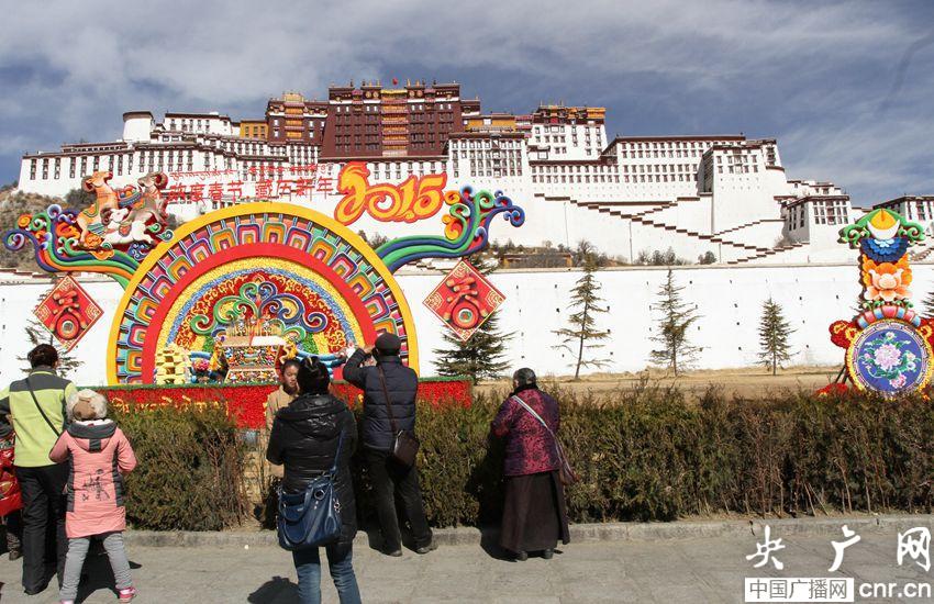 市民在布達拉宮前擺的切瑪和德噶前合影留念(央廣網(wǎng)記者 普布次仁 攝)