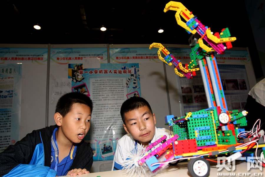 兩名參賽選手正在展示自己制作的垃圾清掃機器人(央廣網(wǎng)發(fā) 周建玲攝)