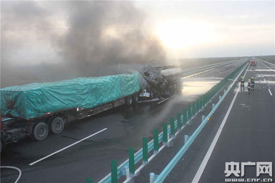 央廣網(wǎng)精河6月13日消息(記者張雷 通訊員賀桂景 陳熙)昨天凌晨6時(shí)17分,新疆博爾塔拉蒙古自治州消防支隊(duì)119接警中心接到報(bào)警:G30連霍高速3961路段精河往伊犁方向一油罐槽車(chē)與重型半掛車(chē)追尾起火,內(nèi)有高標(biāo)號(hào)甲醇50.4立方米,火勢(shì)猛烈,嚴(yán)重威脅到僅距50余米?寇(chē)輛以及下車(chē)圍觀群眾。