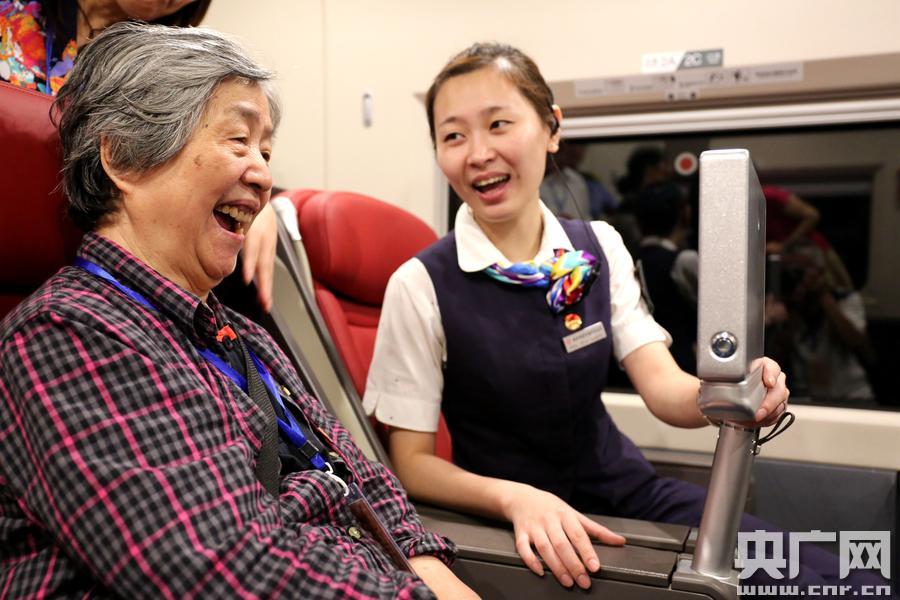 列車長張子玉為85歲高齡的趙彩霞介紹電視功能,老人高興得開懷大笑心。(央廣網(wǎng)發(fā) 雍萬俊攝)
