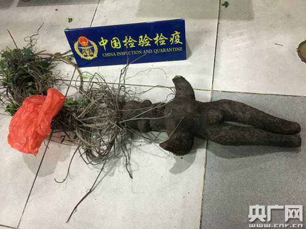 據(jù)悉,這株帶土“何首烏”長(zhǎng)約40厘米、寬約27厘米、重為5.3公斤,外觀酷似人形,購(gòu)于澳門(mén),旅客擬攜帶入境供親人作黑發(fā)藥用。根據(jù)《中華人民共和國(guó)禁止攜帶、郵寄進(jìn)境的動(dòng)植物及其產(chǎn)品名錄》規(guī)定,有繁殖能力的植物、土壤屬于禁止進(jìn)境物品。為進(jìn)一步確定該物品攜帶病蟲(chóng)害情況,檢驗(yàn)檢疫人員進(jìn)行了現(xiàn)場(chǎng)檢疫,在對(duì)物品塊莖解剖時(shí)發(fā)現(xiàn)該物品塊莖切面顏色偏白、質(zhì)地松脆,而真正的何首烏切面有異型維管束環(huán)列,形成云錦花紋,質(zhì)地堅(jiān)實(shí)。在進(jìn)一步解剖后,工作人員發(fā)現(xiàn)其內(nèi)部另有玄機(jī),此“何首烏”實(shí)為蓼科植物何首烏的莖藤與套模具生長(zhǎng)的薯蕷科植物塊莖拼接而成,并非真正的何首烏,也不具備何首烏的藥用價(jià)值。
