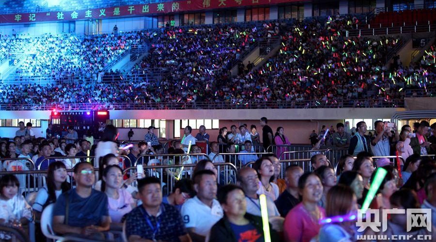 演出現(xiàn)場(chǎng)(央廣網(wǎng)記者 許新霞 攝) 央廣網(wǎng)銀川6月3日消息(記者許新霞 胡鈺)昨晚,由中國(guó)文學(xué)藝術(shù)界聯(lián)合會(huì)、中國(guó)電視藝術(shù)家協(xié)會(huì)、寧夏回族自治區(qū)黨委宣傳部、中國(guó)文學(xué)藝術(shù)基金會(huì)主辦的“中國(guó)夢(mèng)·寧夏情——送歡樂下基層”文藝演出在銀川賀蘭山體育場(chǎng)舉辦,F(xiàn)場(chǎng)2萬(wàn)多觀眾觀看演出,歡呼聲、掌聲不斷。 演出上,王宏偉、呼斯愣等十多位藝術(shù)家,為寧夏觀眾帶來歌舞《國(guó)家》《鴻雁》、詩(shī)朗誦《清平樂·六盤山》《筑夢(mèng)中國(guó) 精彩寧夏》、雜技《肩上芭蕾》等節(jié)目,為銀川市民獻(xiàn)上一場(chǎng)文化盛宴。
