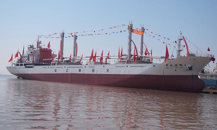 “平太榮冷1”由浙江欣海船舶設(shè)計(jì)研究院設(shè)計(jì),舟山蓬萊船舶修造有限公司建造,鋼質(zhì)船體材質(zhì),船長(zhǎng)108米,寬15.6米,深9.2米,載重噸位6000噸,共有8個(gè)貨艙,一次性能為3000噸~3500噸漁獲提供零下60℃的冷藏運(yùn)輸。