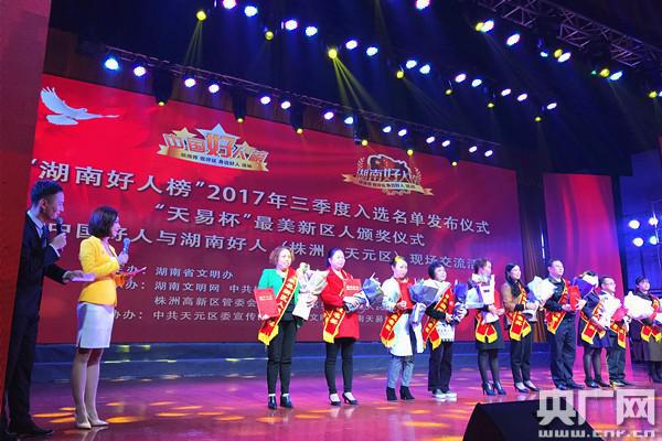 央廣網(wǎng)株洲11月9日消息(記者堯遙)11月8日晚,由湖南省文明辦主辦的“湖南好人榜”2017年三季度入選名單發(fā)布儀式暨中國好人與湖南好人交流活動在湖南省株洲市天元區(qū)舉行,94人(組)入選三季度“湖南好人榜”。湖南省委宣傳部副部長、省文明辦主任劉進能等領導為湖南好人榜2017年三季度入選名單揭榜。
